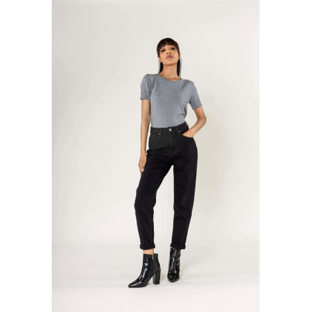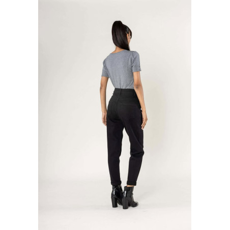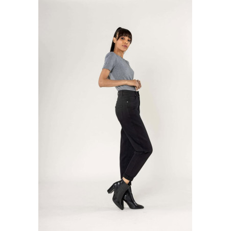 Jeans coupe mom denim noir avec bouton et fermeture éclair en taille haute.