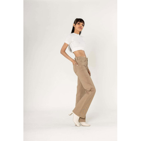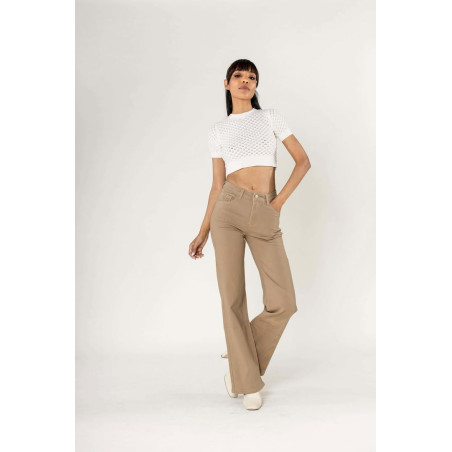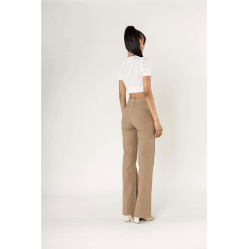 Jeans Flare denim taupe taille haute avec poches, bouton et fermeture éclair, très confortable