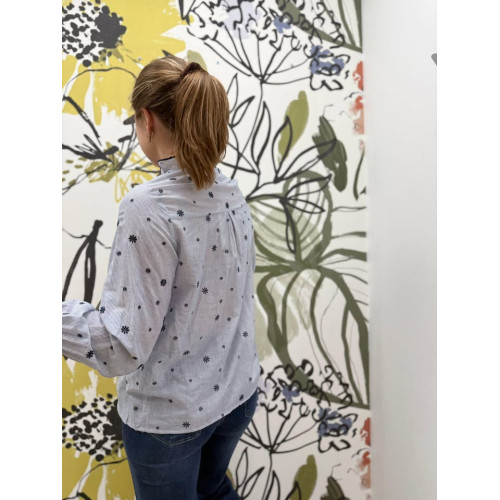 Blouse légère à fines rayures et broderies délicates, col froncé et manches longues smockées. Féminine et raffinée, idéale pour un look chic au quotidien.
