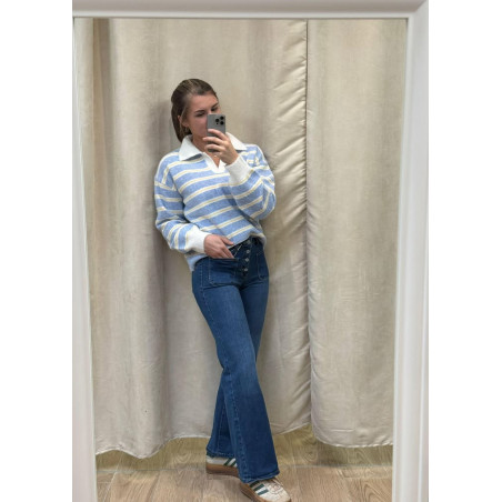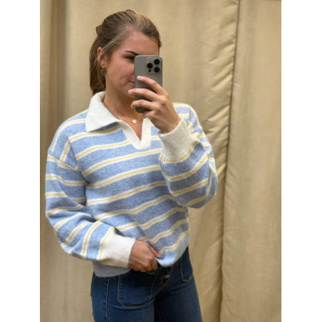 Pull col chemisier en V, rayé bleu, jaune et blanc