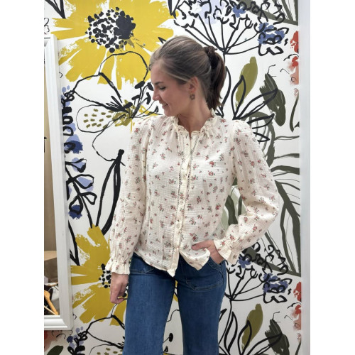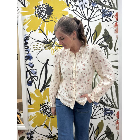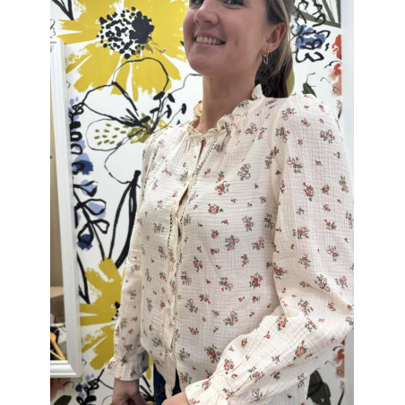 Chemisier en gaz de coton, col avec volants, boutons de haut en bas, élastique au niveau des poignets.