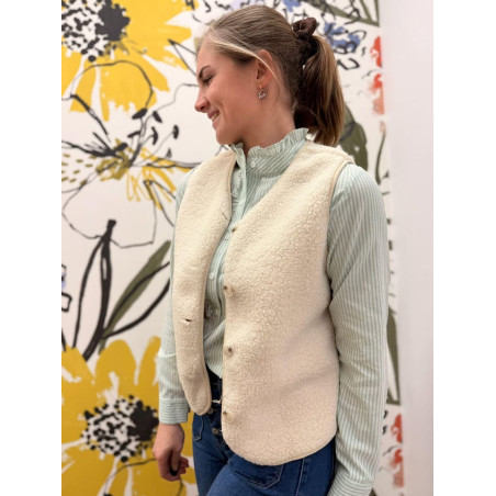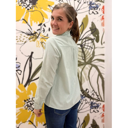 Chemise à fines rayures vertes et blanches, col montant et patte de boutonnage à volants. Féminine et légère, idéale pour un look chic au quotidien.