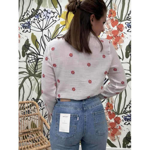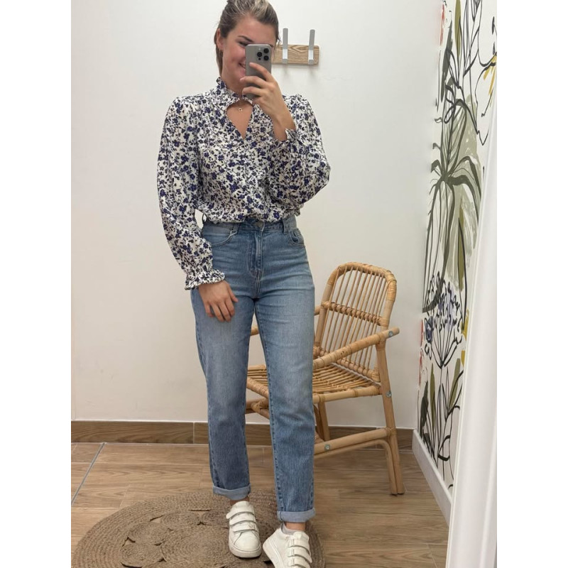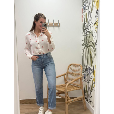 Jeans coupe mom taille haute, détails d'une étiquette LOVE sur la poche arrière
