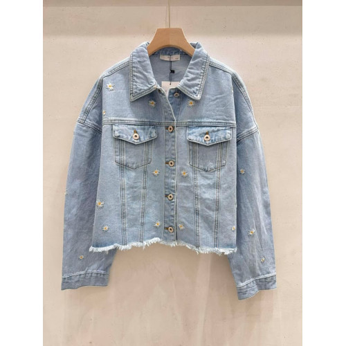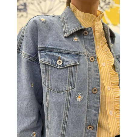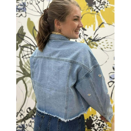 Veste en jeans coupe droite bas effiloché, avec broderies en forme de marguerites