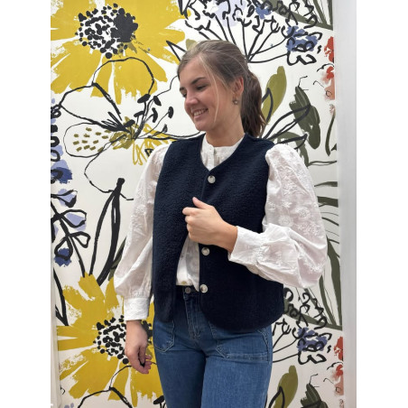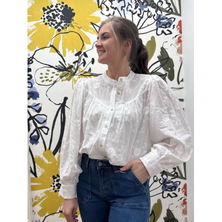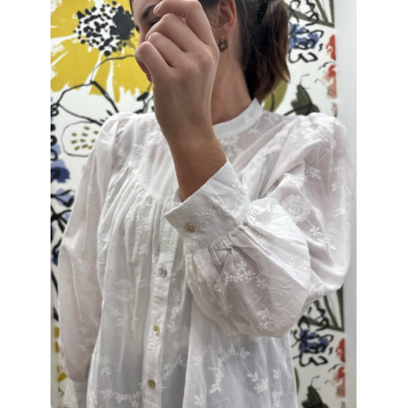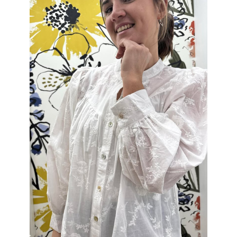 Blouse blanche entièrement brodé avec boutons de haut en bas, manches légèrement bouffantes