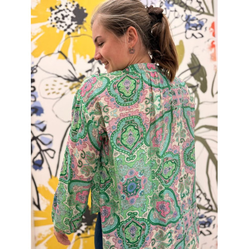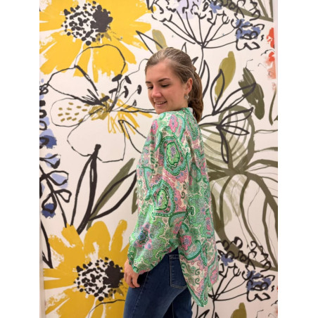 Blouse manches longues avec quelques petits boutons au niveau du décolleté, motifs arabesques. La blouse est asymétrique, l'arrière est plus long