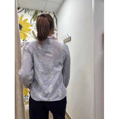 blouse manches longues rayée avec détails brodés, avec son col à volants et ses poignets élastiqués