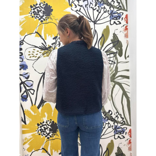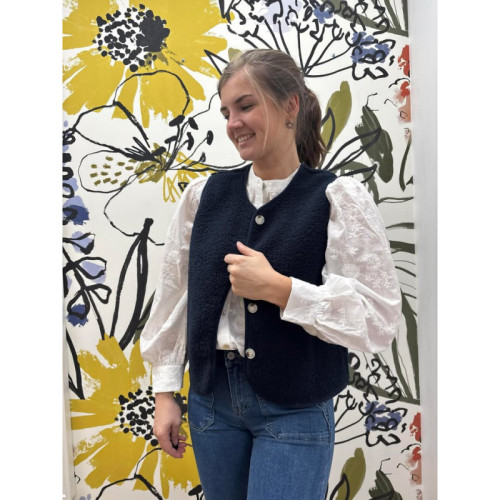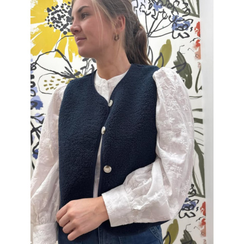 Gilet sans manches effet bouclette bleu marine avec gros boutons à l'avant , se pose parfaitement sur un pull fin, une blouse, un chemisier ou encore une robe