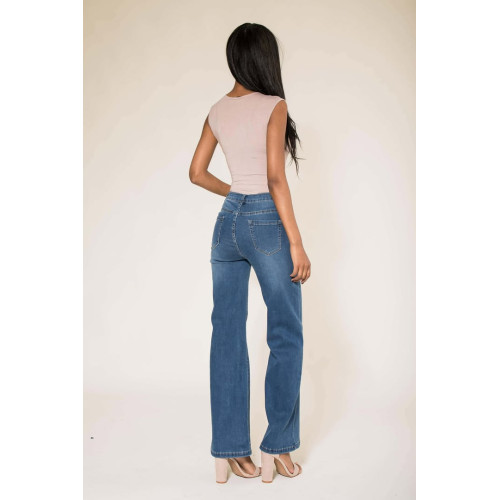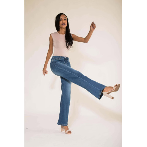 Jeans Flare bleu medium taille haute avec poches, bouton et fermeture éclair, très confortable