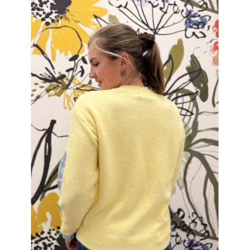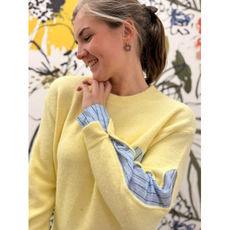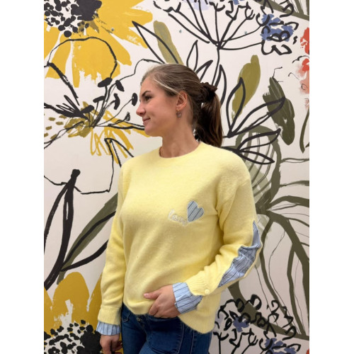 Pull col rond avec coeur brodé jaune et détails ouverts au niveau des manches , imprimé bleu jeans rayé