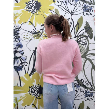 Pull col rond avec détails floraux aux poignets et au col, dans un rose très doux
