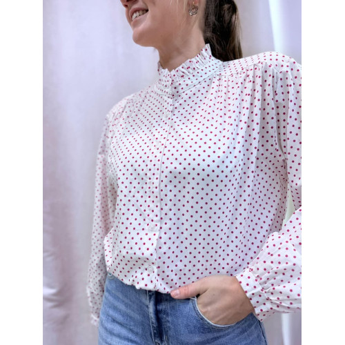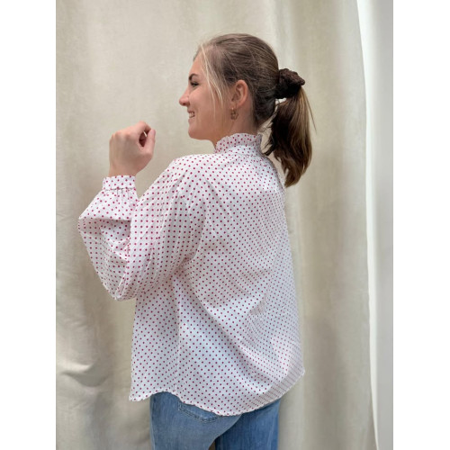 Blouse légère à pois rouges, col montant froncé et manches longues. Féminine et élégante, parfaite pour un look chic au quotidien.