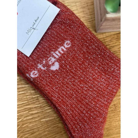 Chaussettes à paillettes brique avec écriture JE T'AIME en rose claire