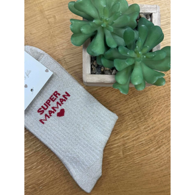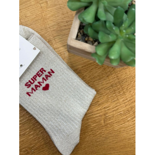 Chaussettes à paillettes beige avec écriture super maman en rouge