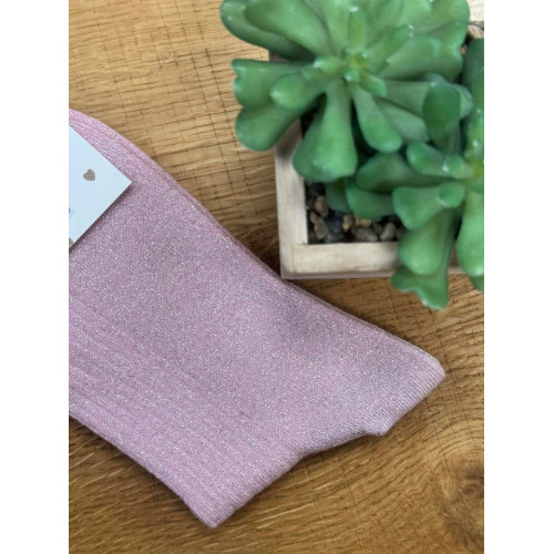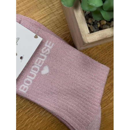 Chaussettes à paillettes rose avec écriture BOUDEUSE en blanc
