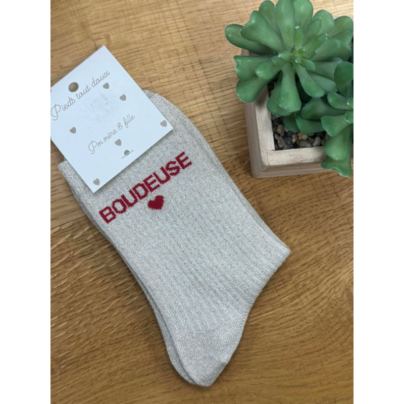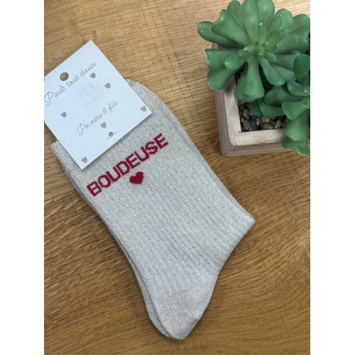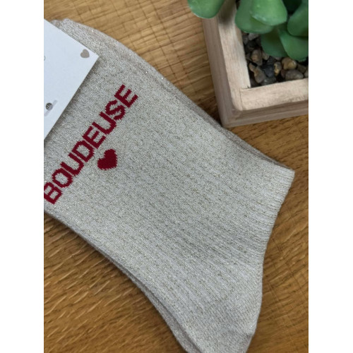 Chaussettes à paillettes beige avec écriture BOUDEUSE en rouge