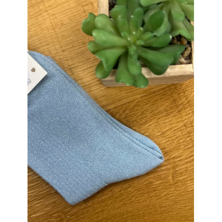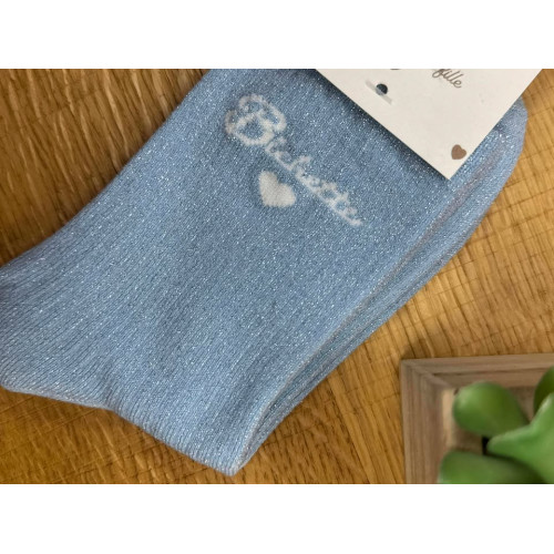Chaussettes à paillettes bleu avec écriture BICHETTE en blanc