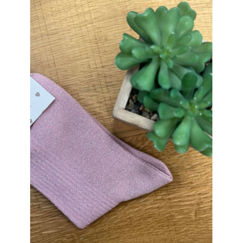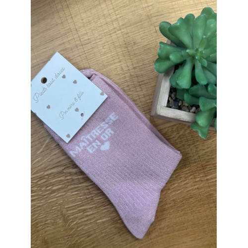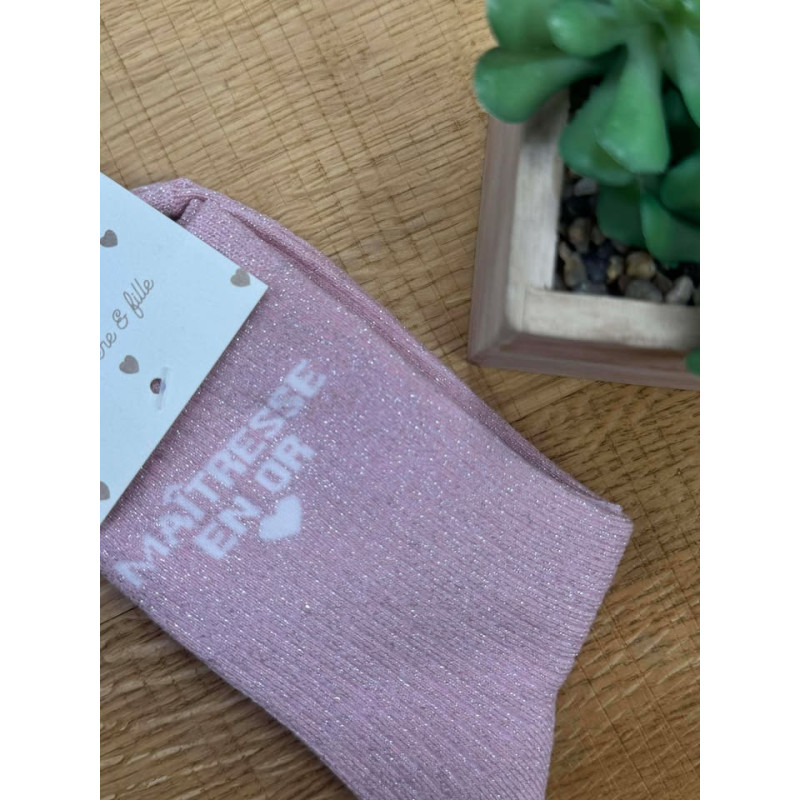 Chaussettes à paillettes rose écriture maîtresse en or