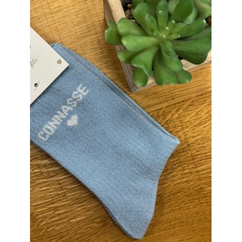 Chaussettes à paillettes bleu avec écriture Connasse