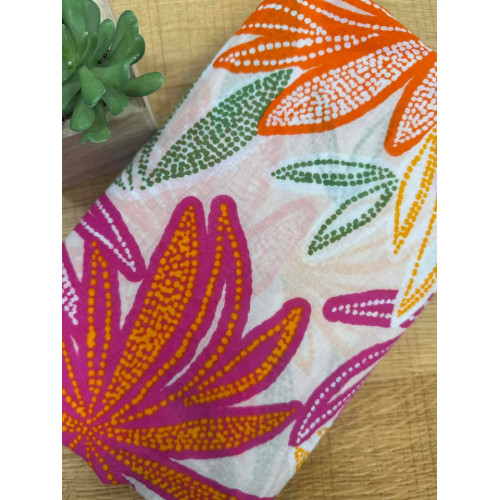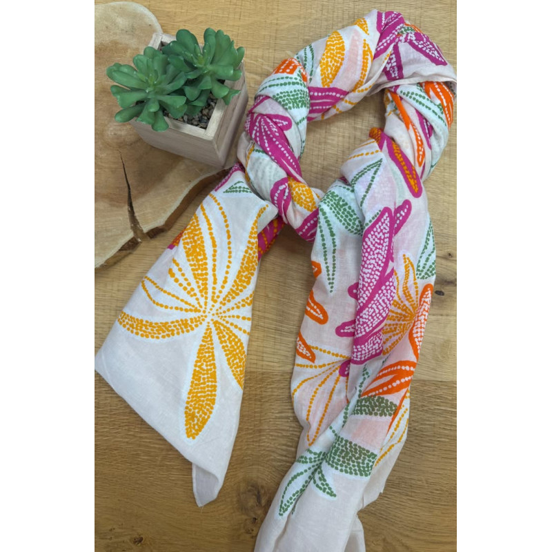 Foulard base crème avec feuillage rose, orange, jaune et vert