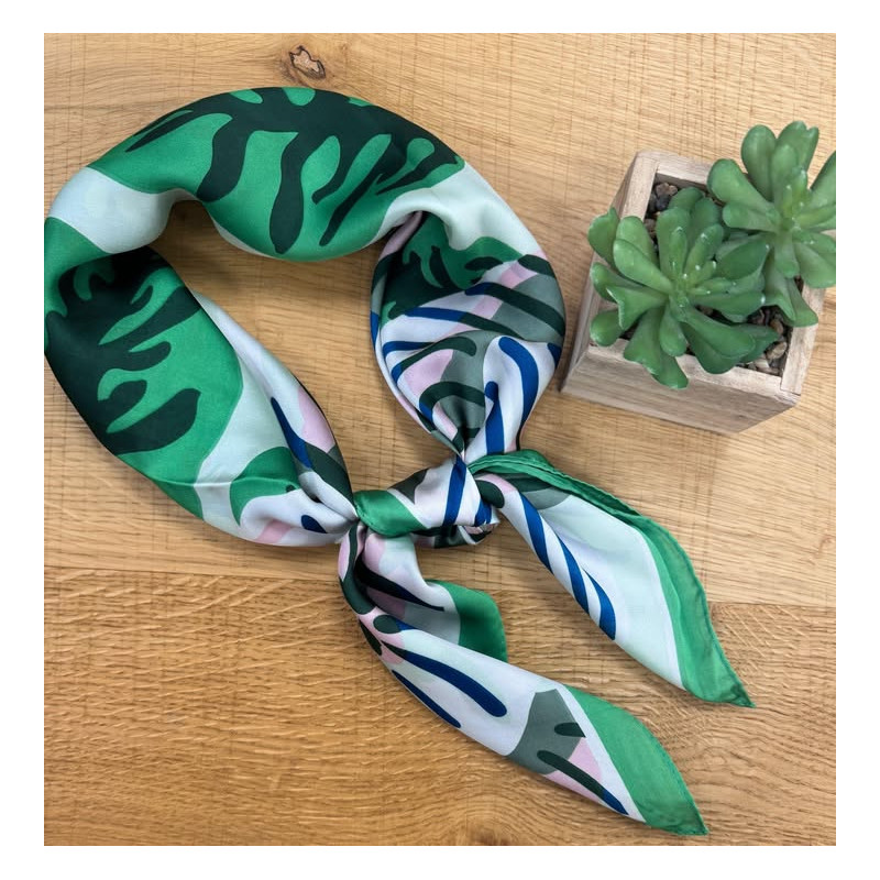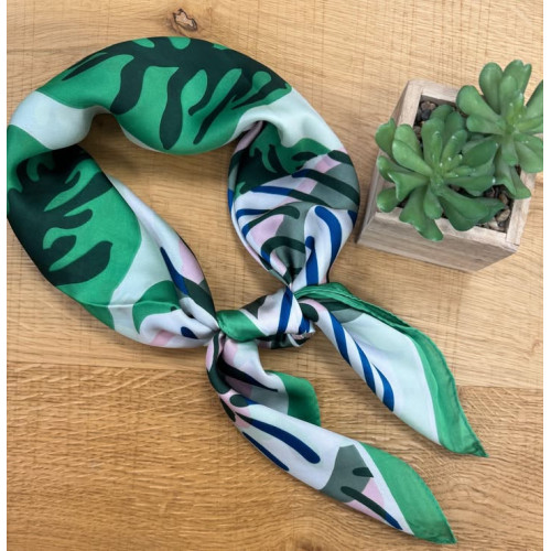 Carré de soie dans les tons verts, bleus, blanc, rose