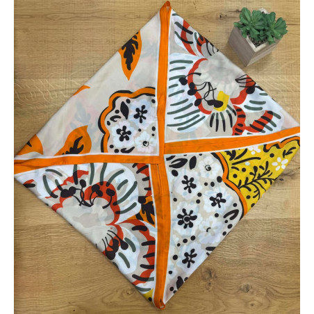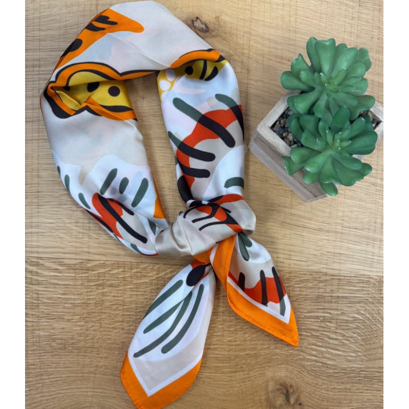Carré de soie dans les tons orange, jaune, noir, blanc,..