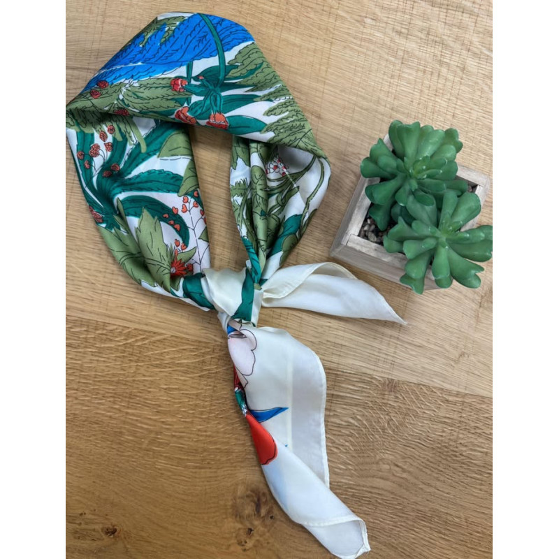 Carré de soie thème coquelicot rose & rouge, feuilles vertes