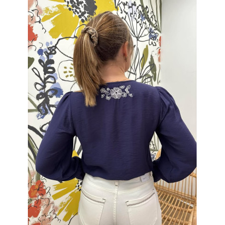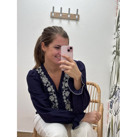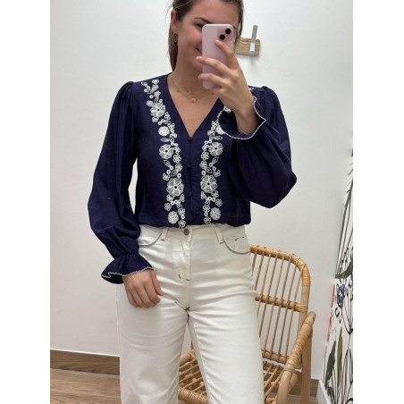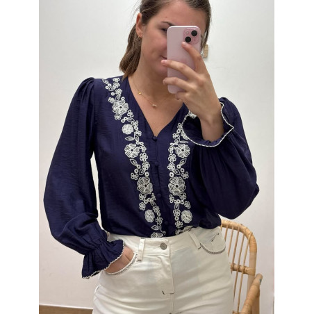 Blouse avec boutons sur le devant & manches resserrées, broderies sur le devant ainsi qu'en haut du dos