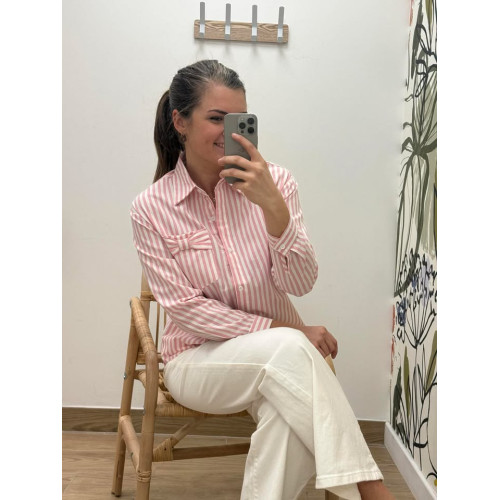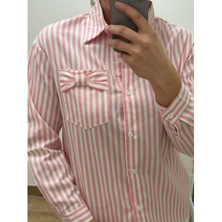 Chemisier à rayures rose & blanc avec poches sur le devant ainsi qu'un petit noeud