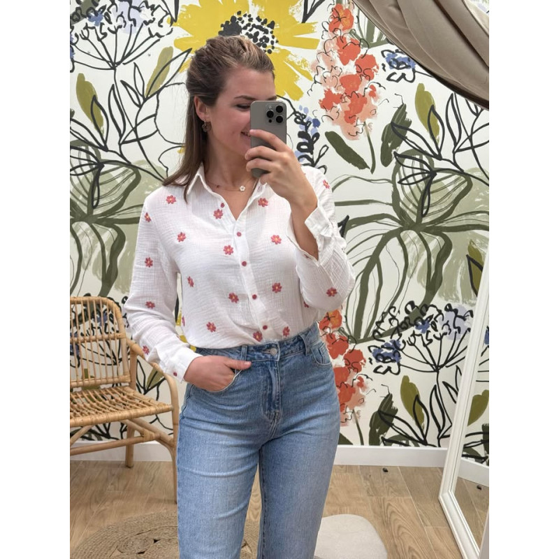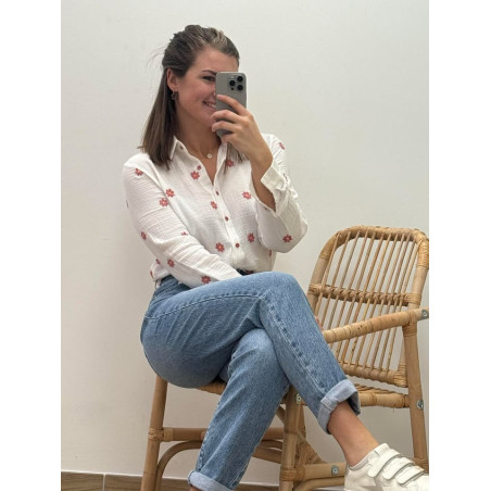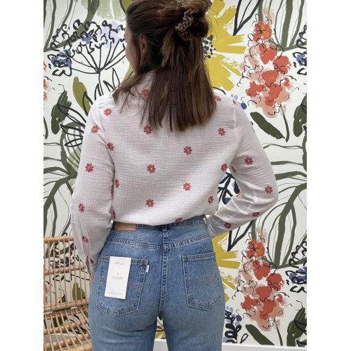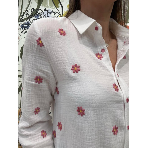 Chemisier en gaz de coton avec broderies de fleurs vieux rose