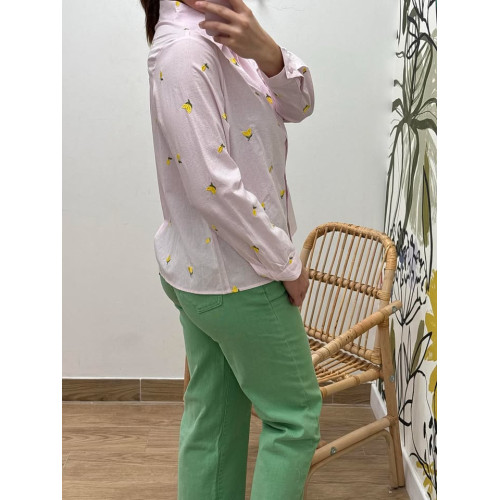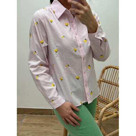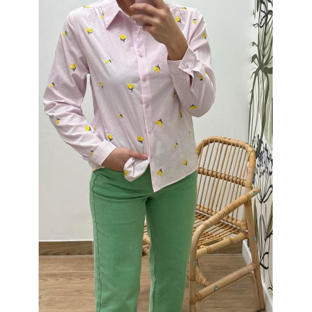 Chemisier à rayures rose & blanc avec des petits citrons brodés, boutonnière pour remonter la manche en 3/4
