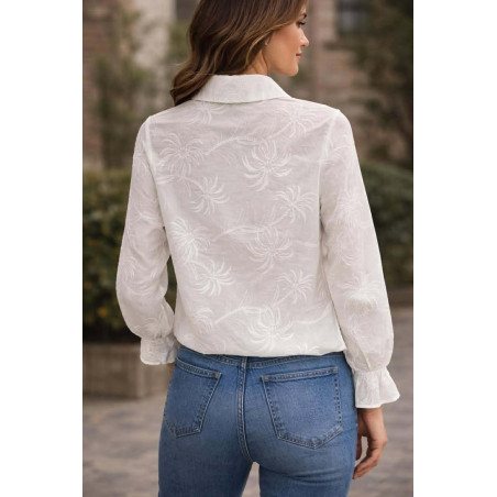 Chemisier blanc avec broderies de palmiers, boutons de haut en bas & resserrée aux manches