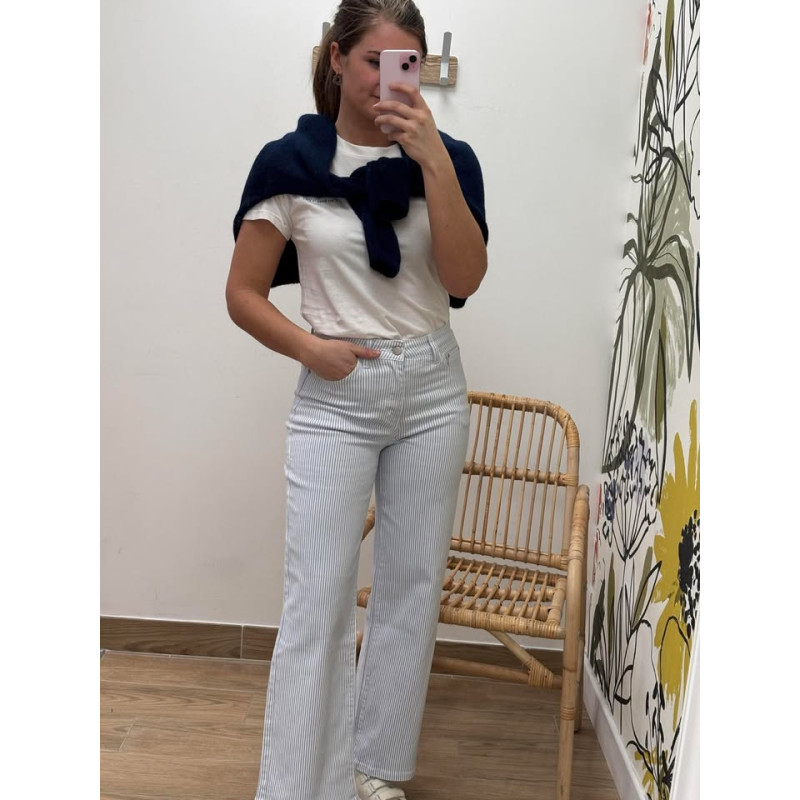 Jeans taille haute wide leg è rayures, petit coeur brodé sur la poche arrière
