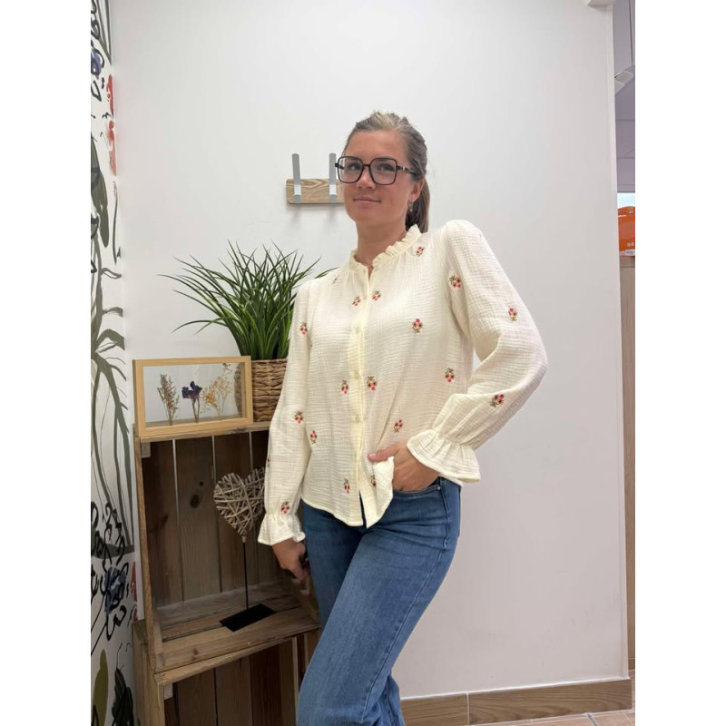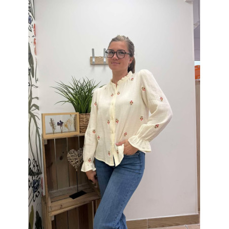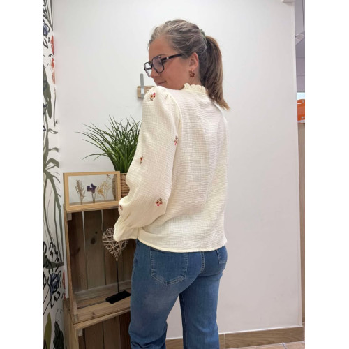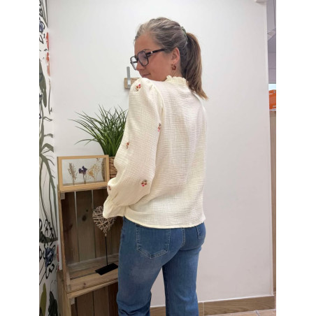 Blouse en gaz de coton base crème avec broderies de fleurs sur le devant ainsi qu'aux manches