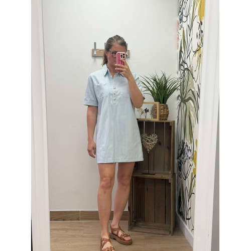 Robe courte en jeans bleu...Robe courte en jeans, matière légère avec détails d'une poche à l'avant et col chemisier