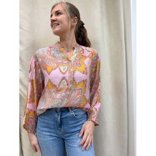 Blouse manches longues avec quelques petits boutons au niveau du décolleté, motifs arabesques. La blouse est asymétrique, l'arrière est plus long...