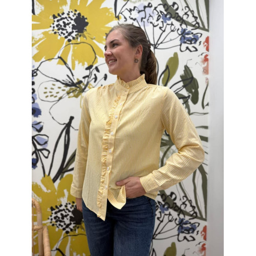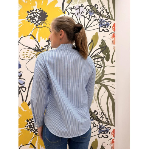 Chemise rayée à volantsChemise à fines rayures bleues et blanches, col montant et patte de boutonnage à volants. Féminine et légère, idéale pour un...