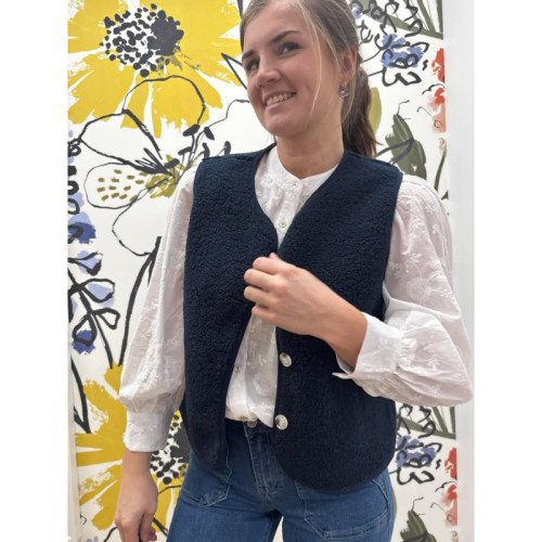 Gilet sans manches effet bouclette bleu marine avec gros boutons à l'avant , se pose parfaitement sur un pull fin, une blouse, un chemisier ou...