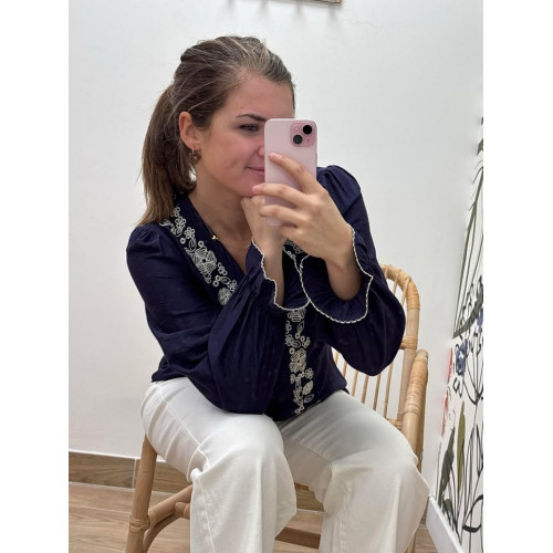 Blouse avec boutons sur le devant & manches resserrées, broderies sur le devant ainsi qu'en haut du dos