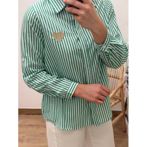 Chemisier à rayures avec broderie de coeur doré sur l'avant, boutonnière pour remonter la manche au 3/4