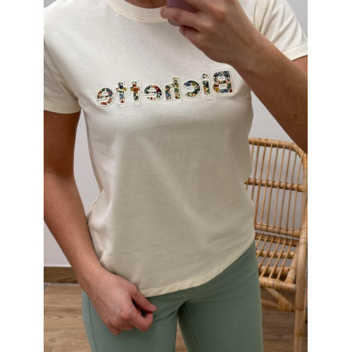 Chemisier rayé bleu marine et blanc avec broderies d'inscription sur l'avant