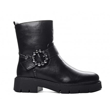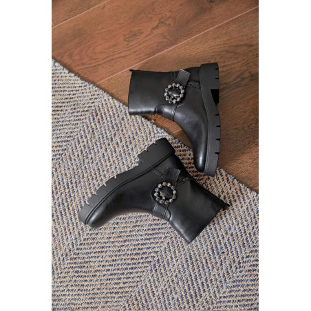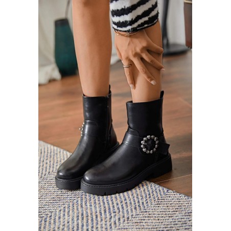 bottines noires avec boucle argentée, fermeture éclaire sur le côté