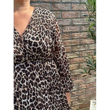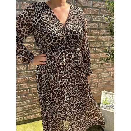 Robe longue plissée léopard à manches longues, doublée à l'intérieur