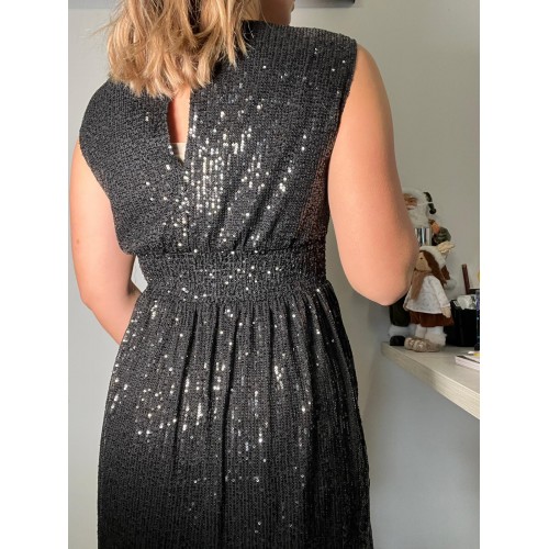 Robe sans manches en cache cœur avec taille élastiquée à sequins, entièrement doublée.