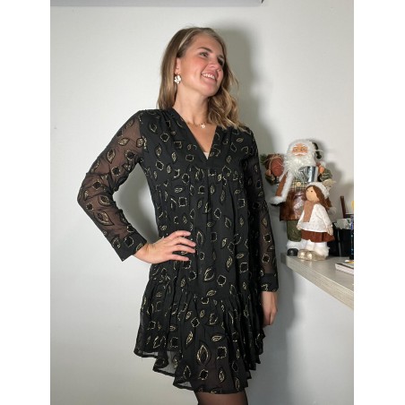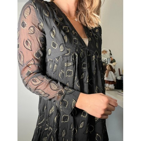 Robe col V manches longues, coupe légèrement évasée , entièrement doublée sauf aux bras.
