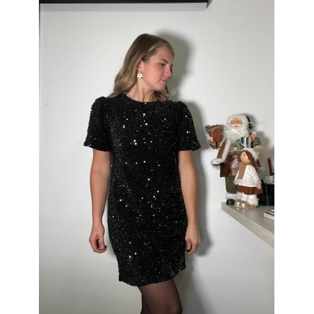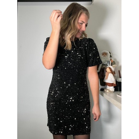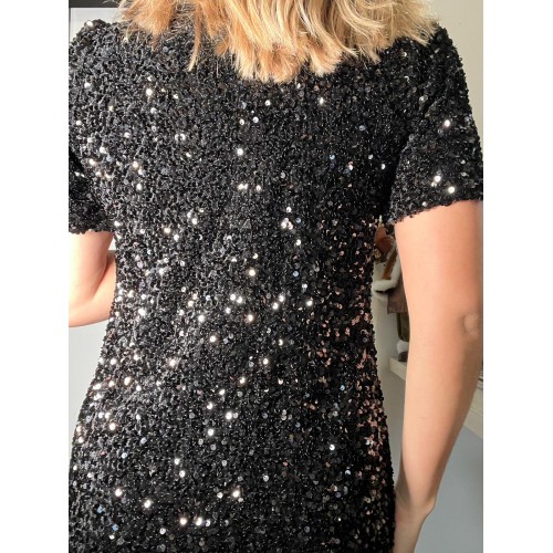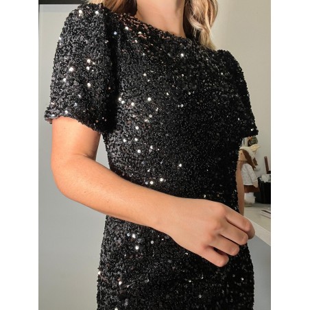 Robe coupe droite à sequins noirs col rond manches courtes, doublée en totalité