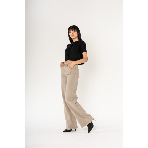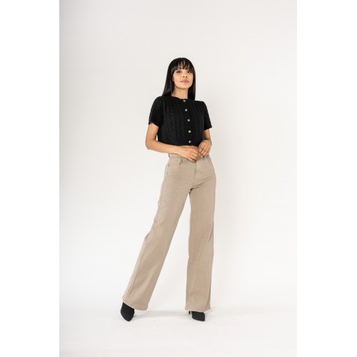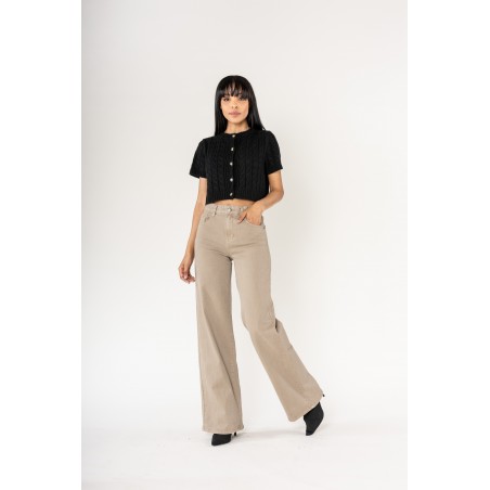 Jeans color Wide Leg avec bouton et fermeture éclair, 2 poches à l'avant et 2 poches à l'arrière. Attention longueur 34, ne convient pas pour les personnes de moins 1m65 voulant les porter sans talons. Matière confortable à porter
