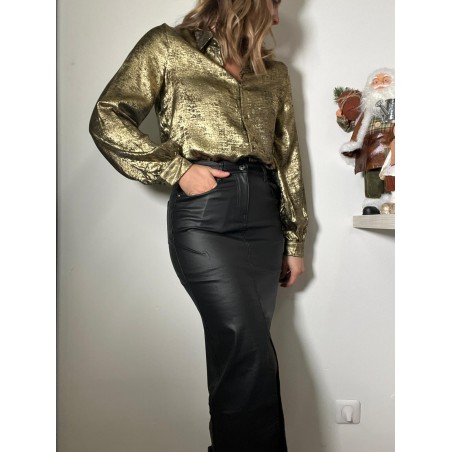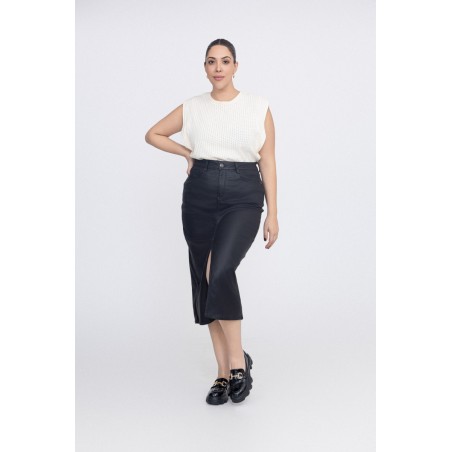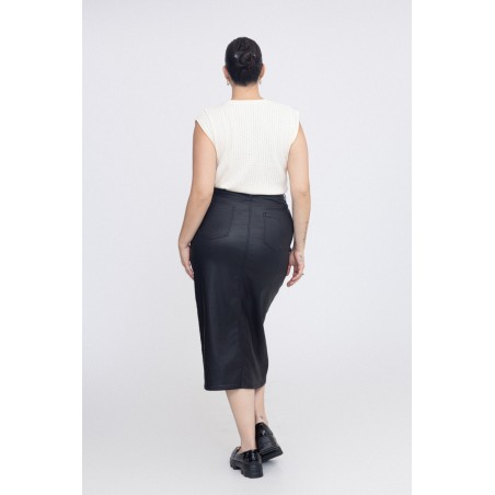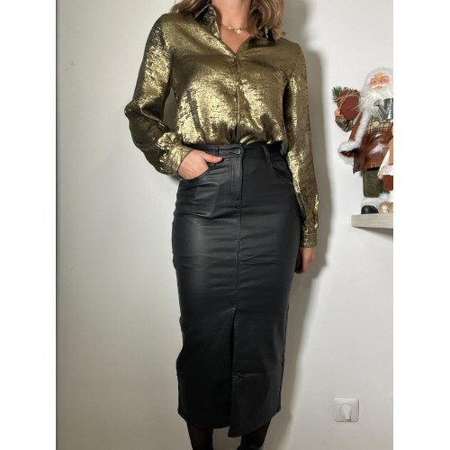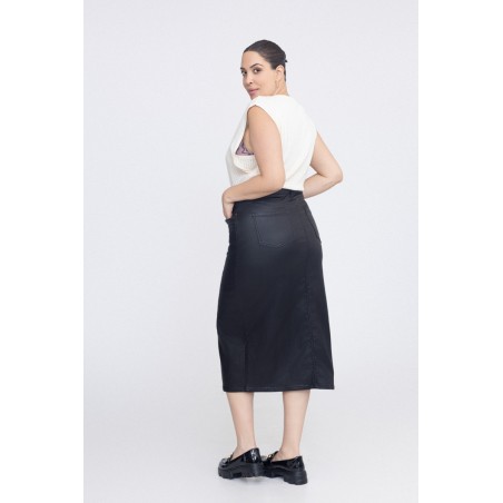 Jupe longue enduit fendue sur le dedans, fermeture éclair et bouton.