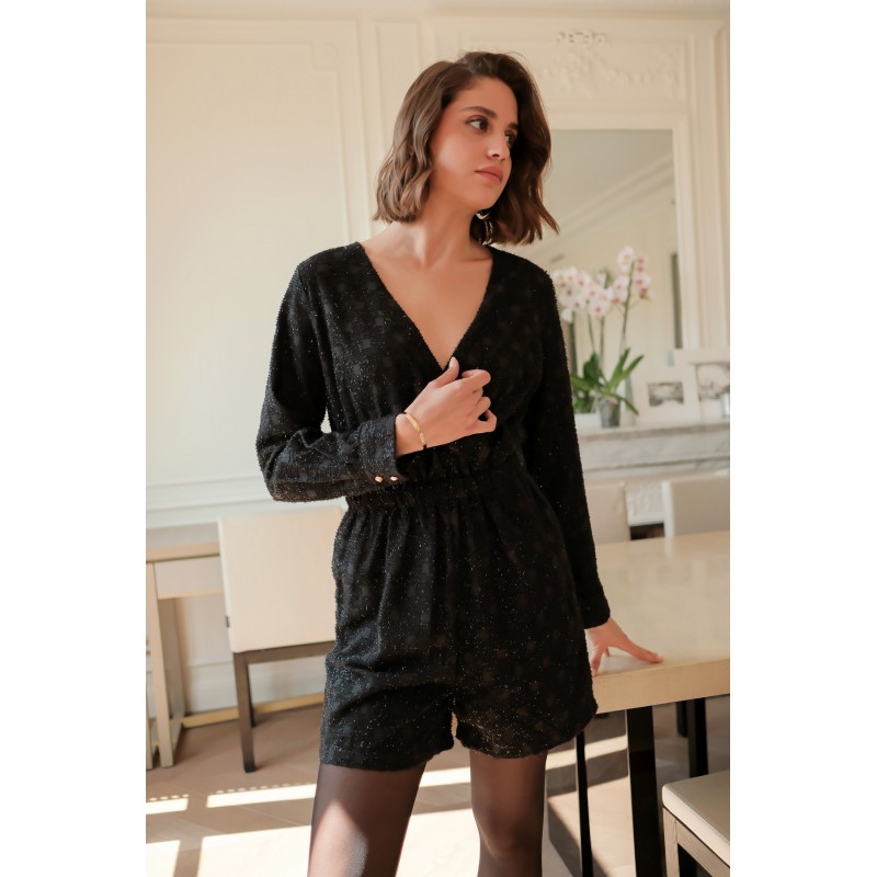 Combi short avec taille élastiquée en cache coeur, bouton au dos. La pièce idéale pour vos tenues de fêtes