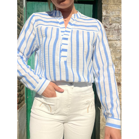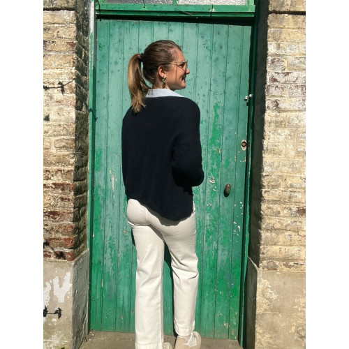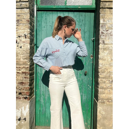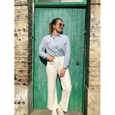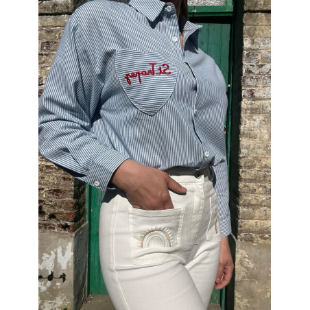 Jeans coupe droite blanc avec détails sur les poches à l'avant côté gauche broderie d'un arc en ciel et côté droit broderie d'un palmier